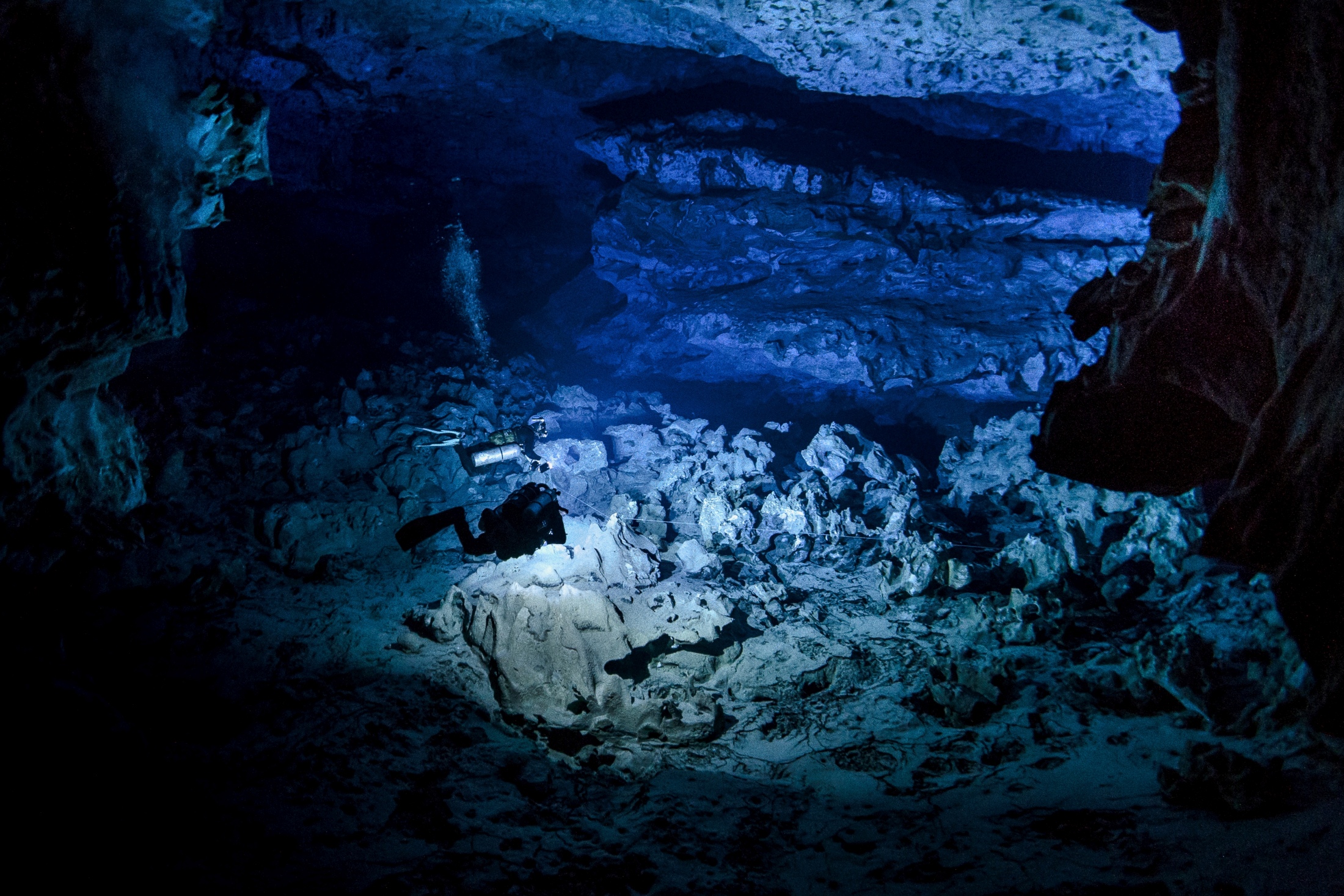 The process of exploring a flooded cave system can be challenging not just from the remoteness of the location, the logistics of getting gas, safety and more, but simply in the scale of the task. Characterised by large rooms and long passageways, often separated by small restrictions requiring partial removal of the divers equipment, quantifying and understanding of the size of the Malazamanga cave in the pitch dark, lit only by the divers lights is immense. In fact until filming quality lighting systems of many tens of thousands of lumen were brought into the cave, what at first were tought to be walls turned into massive columns of rock. In addition what were thought to be additional passageways revealed themselves at a single, 200 meter plus wide chamber.