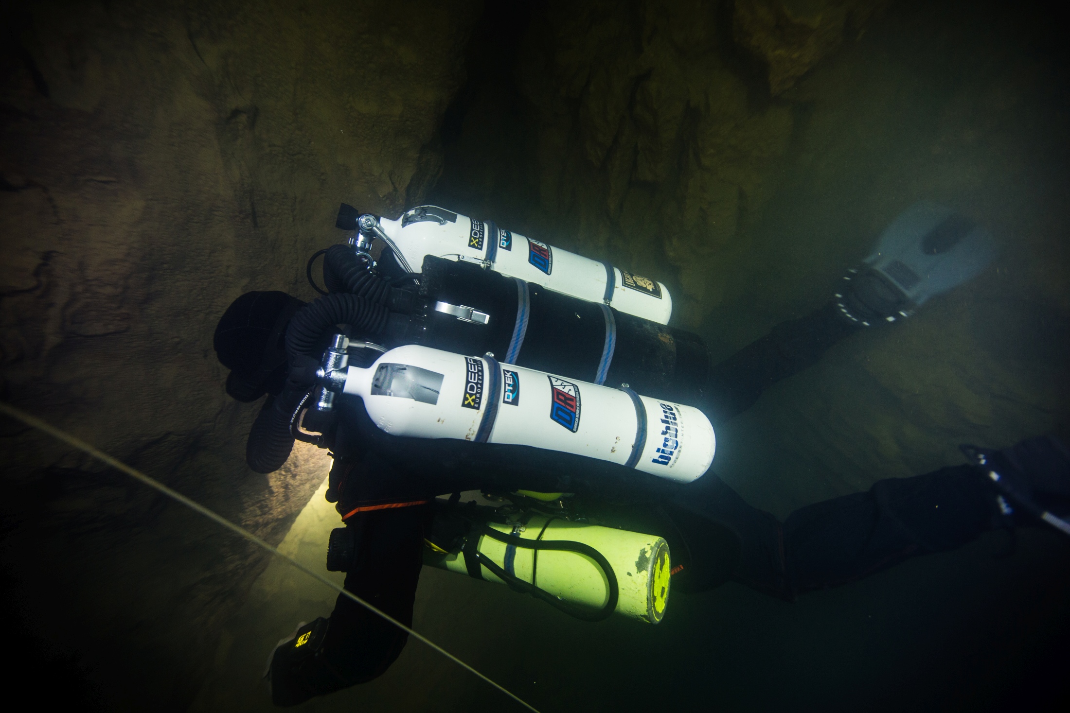 Then after entering sump 2 it’s about a five hundred meter swim and without warning the floor disappears and the cave passage turns into an epic canyon that goes from zero to over one hundred meters deep. At the end of the canyon the ceiling drops down and dips under a ledge that opens up into a huge void.