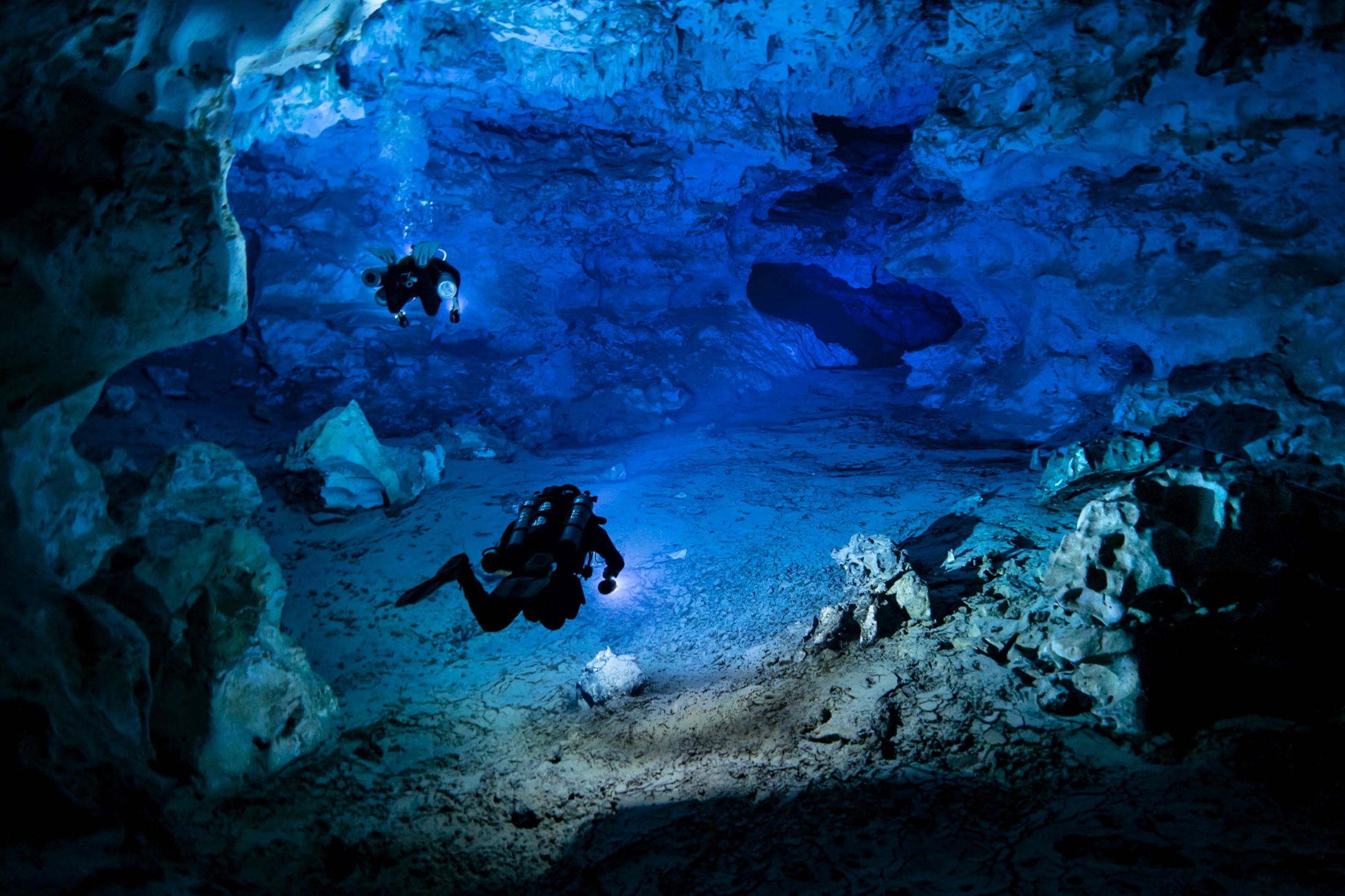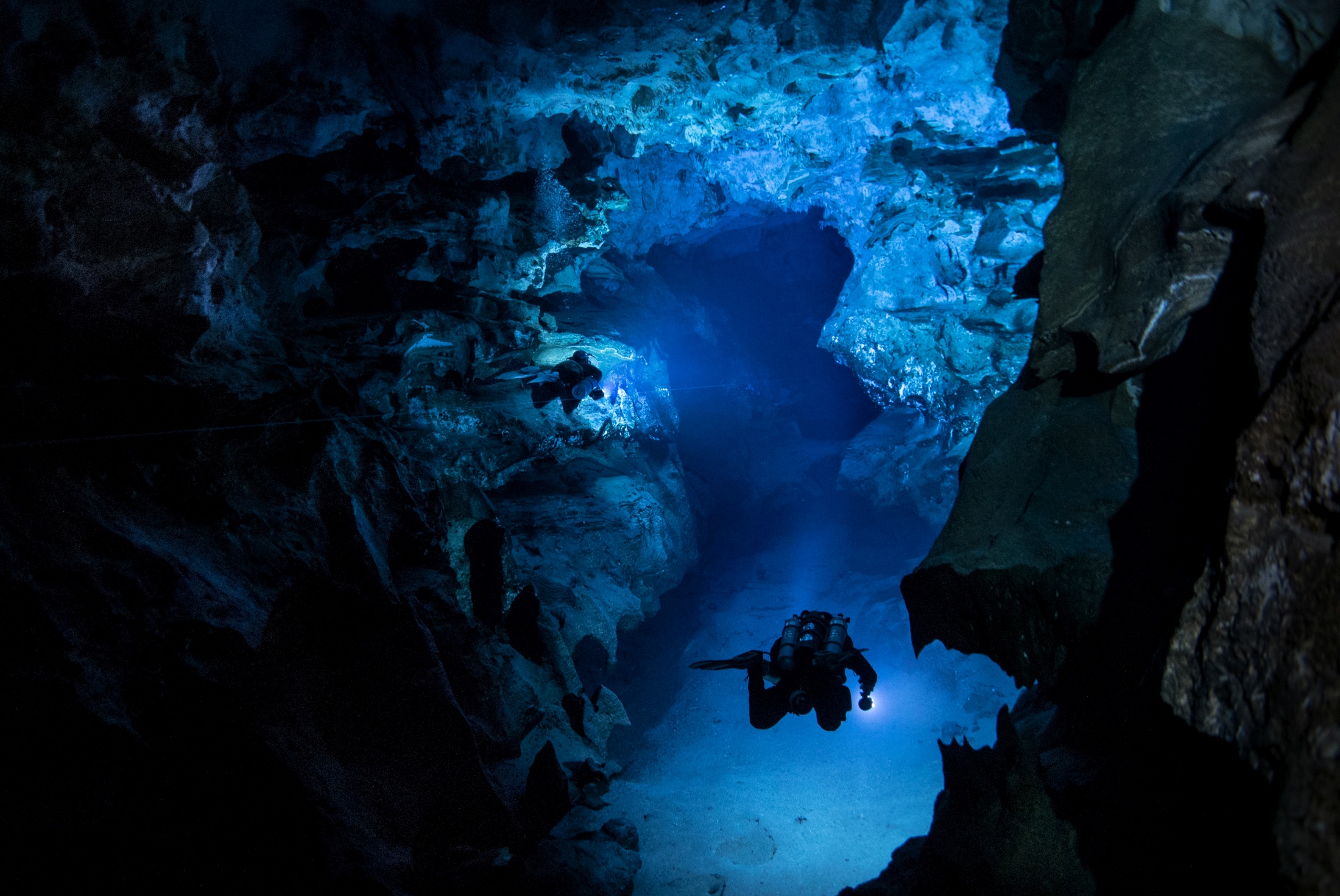 The process of exploring a flooded cave system can be challenging not just from the remoteness of the location, the logistics of getting gas, safety and more, but simply in the scale of the task. Characterised by large rooms and long passageways, often separated by small restrictions requiring partial removal of the divers equipment, quantifying and understanding of the size of the Malazamanga cave in the pitch dark, lit only by the divers lights is immense. In fact until filming quality lighting systems of many tens of thousands of lumen were brought into the cave, what at first were tought to be walls turned into massive columns of rock. In addition what were thought to be additional passageways revealed themselves at a single, 200 meter plus wide chamber.