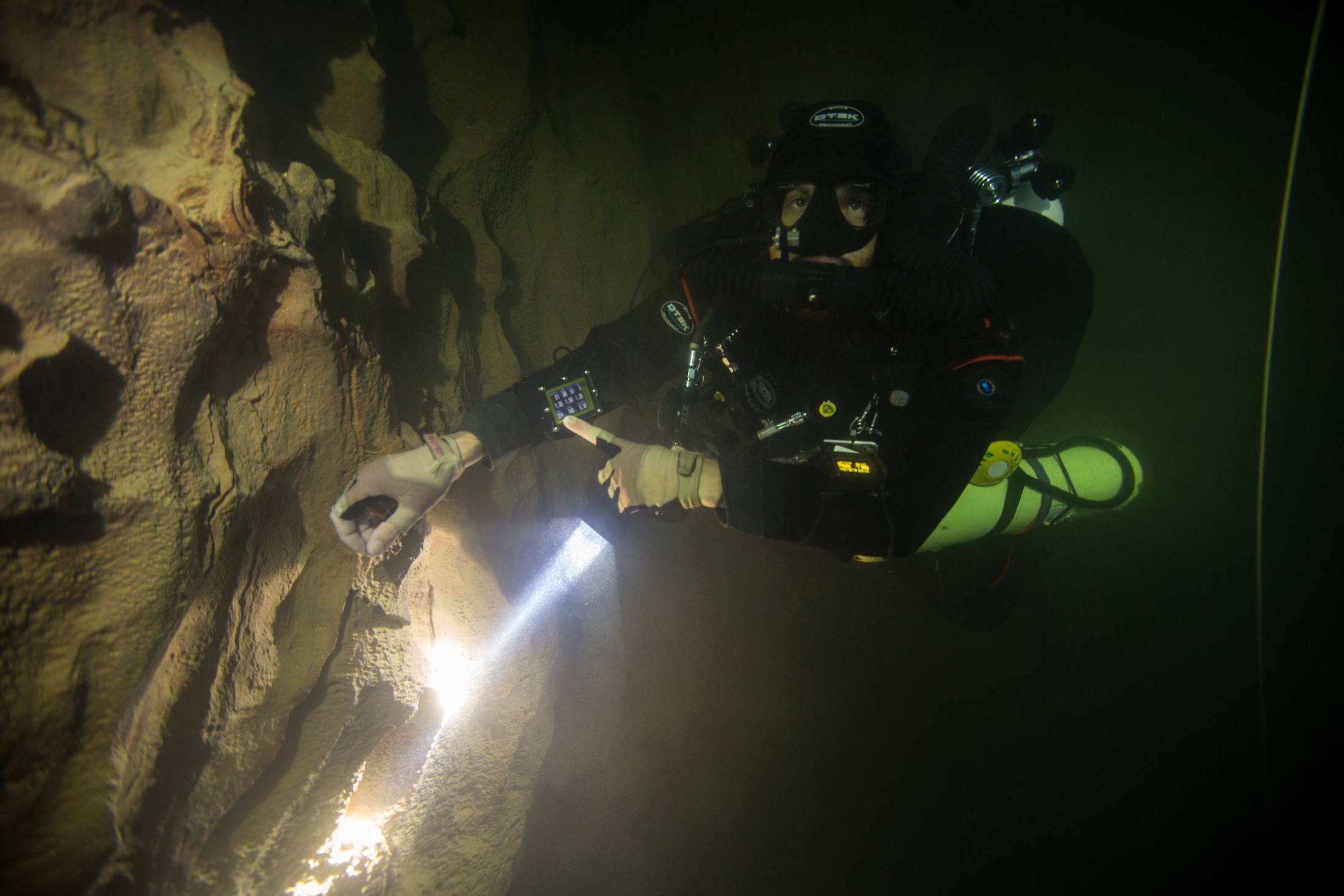 Then after entering sump 2 it’s about a five hundred meter swim and without warning the floor disappears and the cave passage turns into an epic canyon that goes from zero to over one hundred meters deep. At the end of the canyon the ceiling drops down and dips under a ledge that opens up into a huge void.