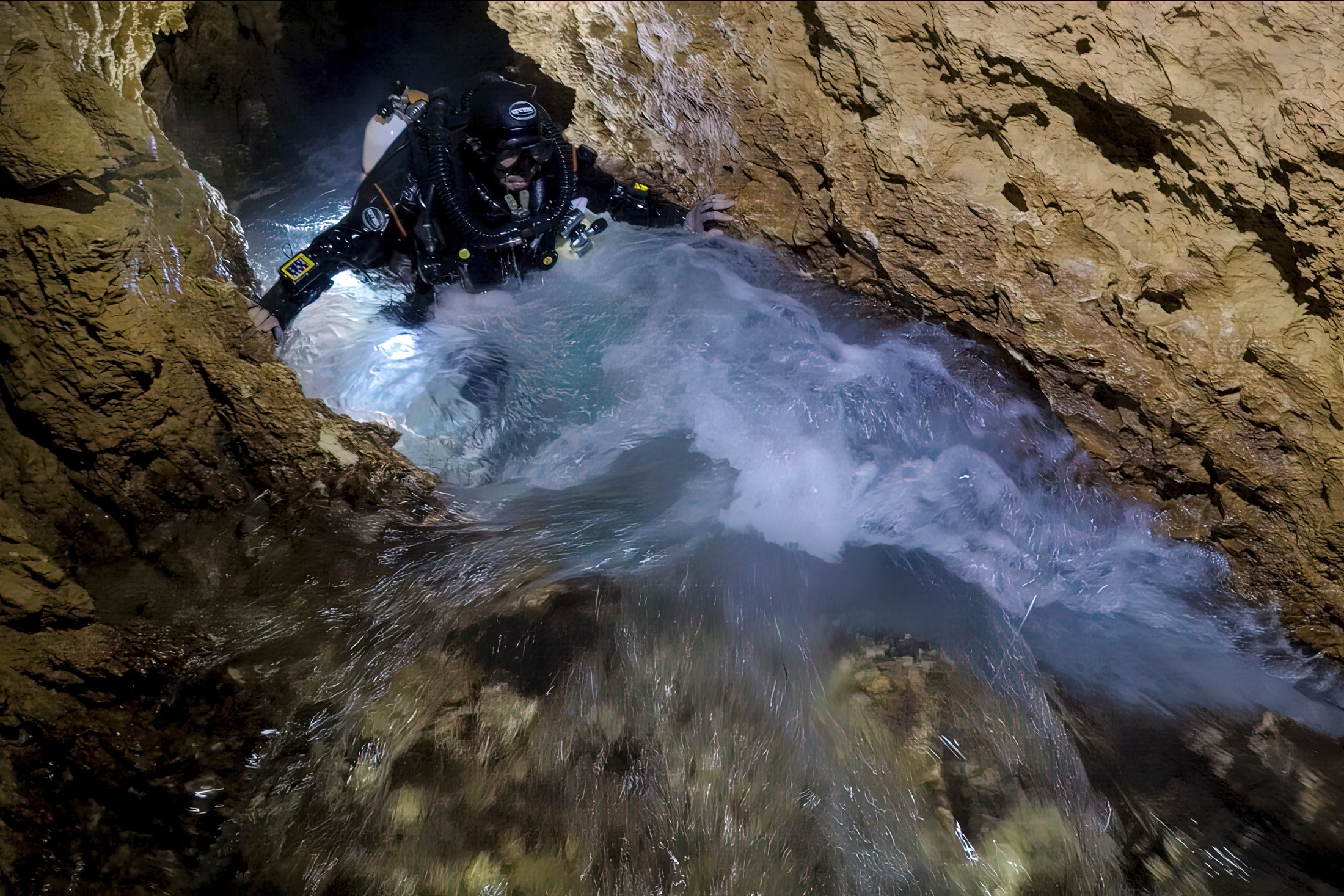 The two springs are very different, the smaller entrance is the shallow side has a max depth of 22 meters and as of now comes up in a dry cave that continues until you hit a waterfall and another sump that keeps going.